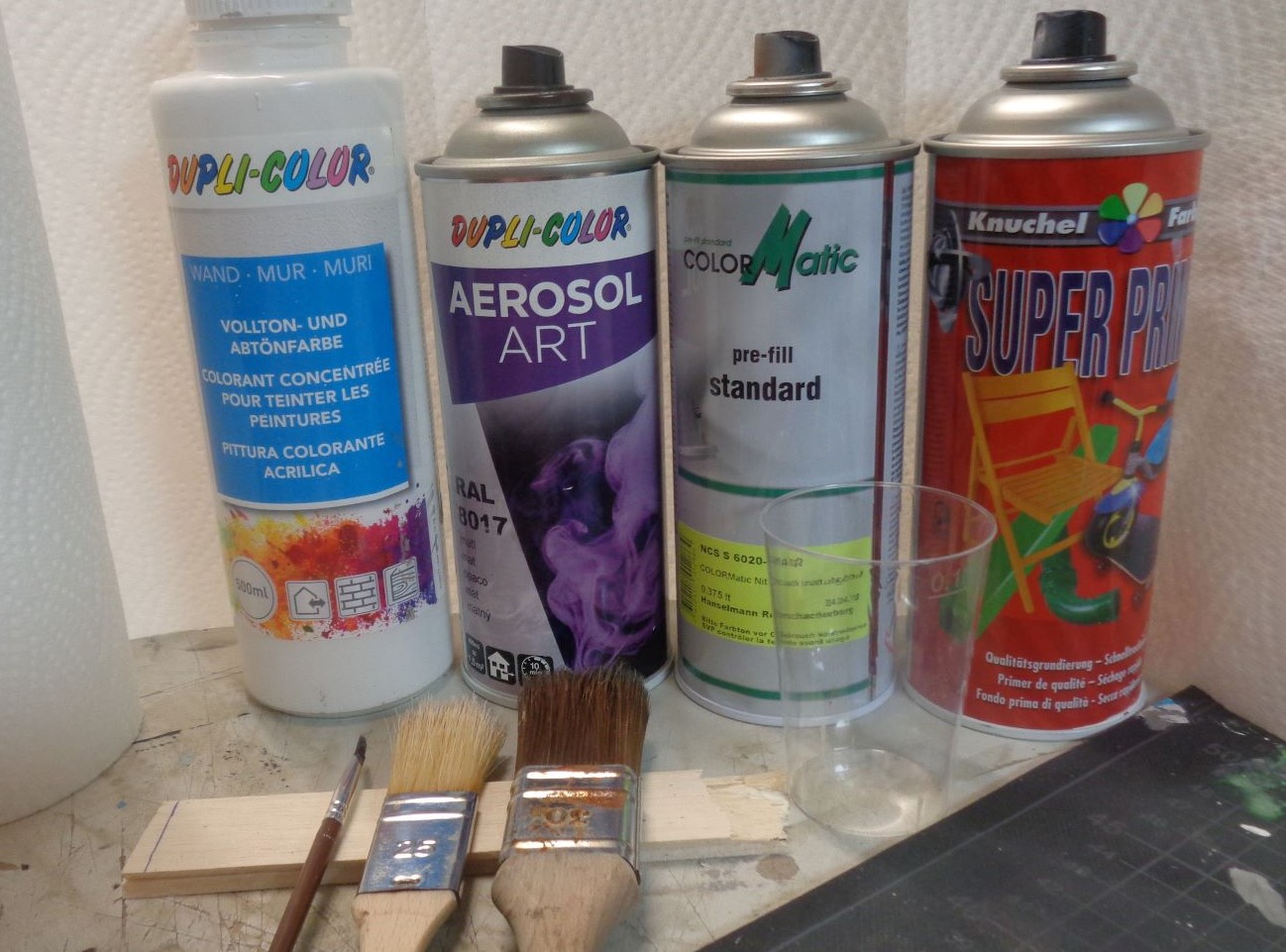 Um die Gleise zu Altern gehe ich wie folgt vor und benötige 1x HR-Rost , 1 x Grundierung hellgrau , 1x Schokoladenbraun matt, etwas weisse Abtönfarbe sowie verschiedene Pinsel.