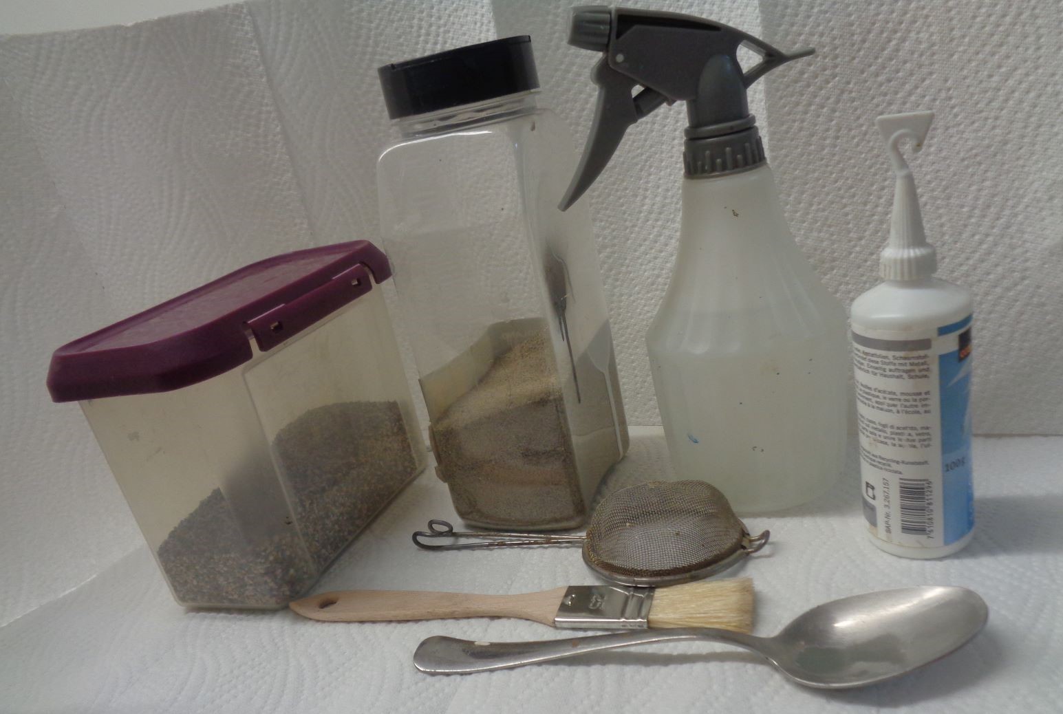 Zum Einschottern nehme ich etwas feinen Sand ( aus Nachbars Sandkasten ) , 1 Wassersprühflasche , verdünnten Weissleim , eine Schottermischung , ein altes Teesieb sowie einen Löffel.