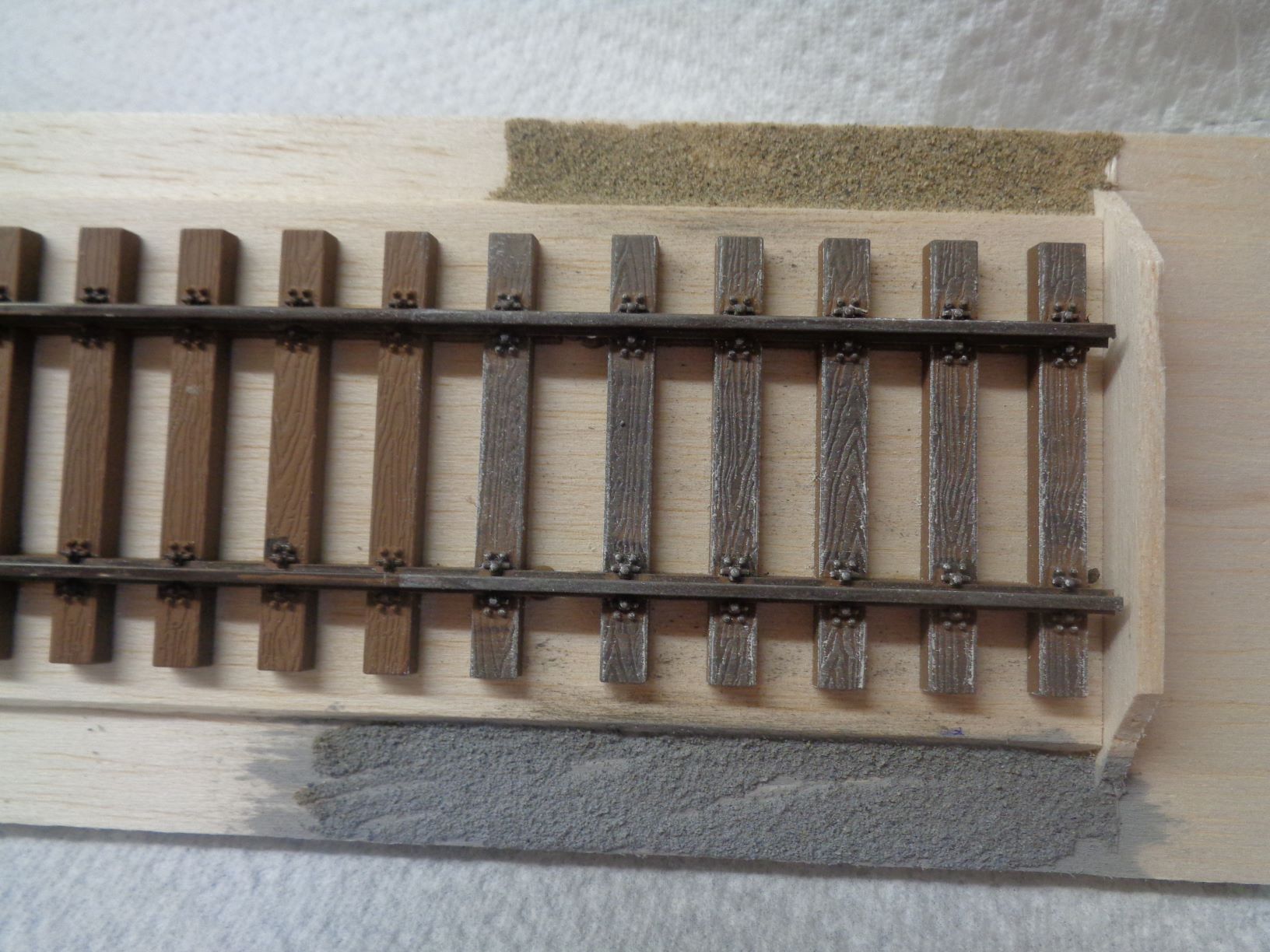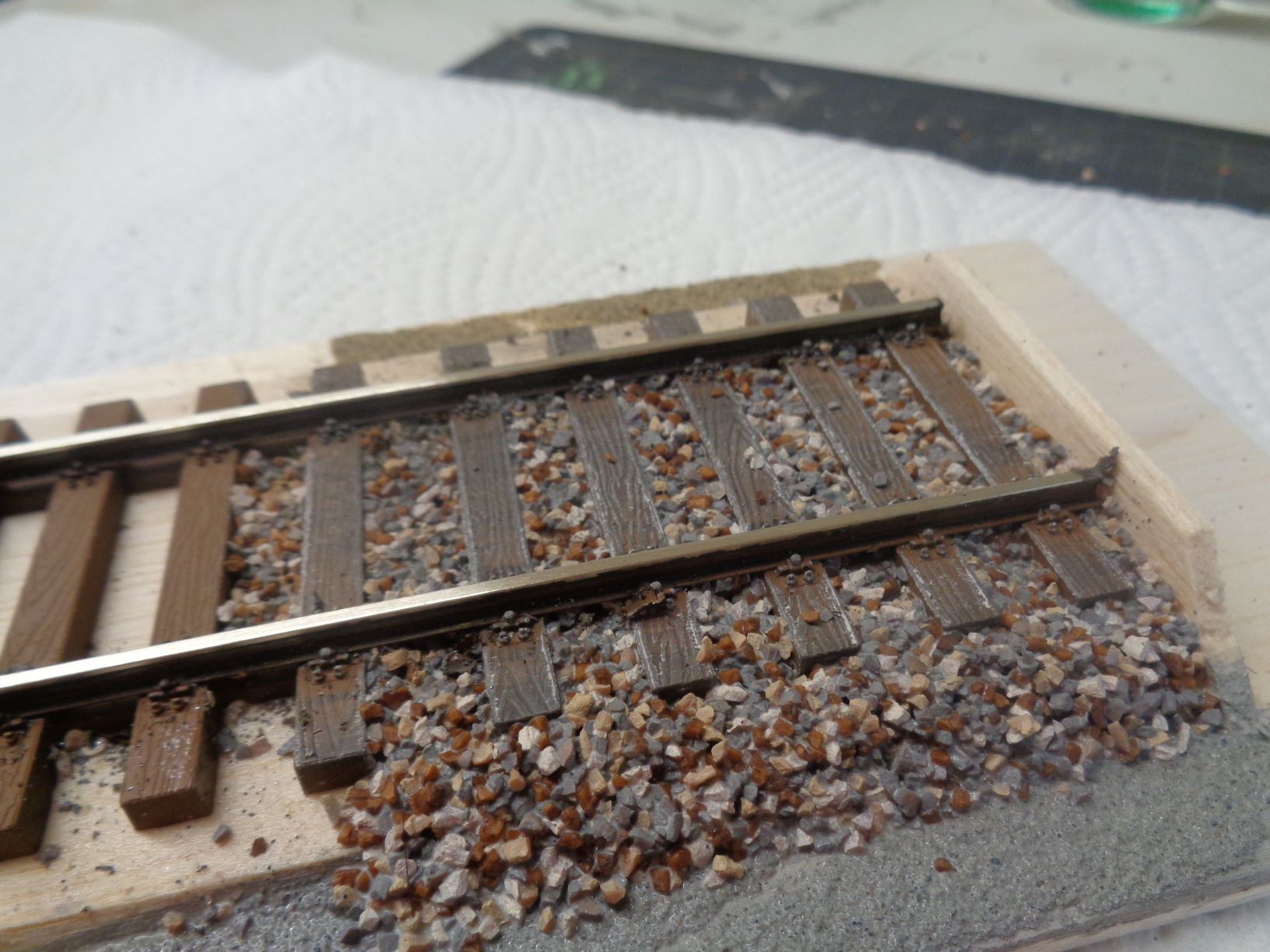 Nun streue ich den Schotter mit dem Löffel zwischen die Schwellen und auch ausserhalb, und verteile diesen mit dem Fettpinsel aus Mutters Küche bis mir das Ergebnis gefällt.