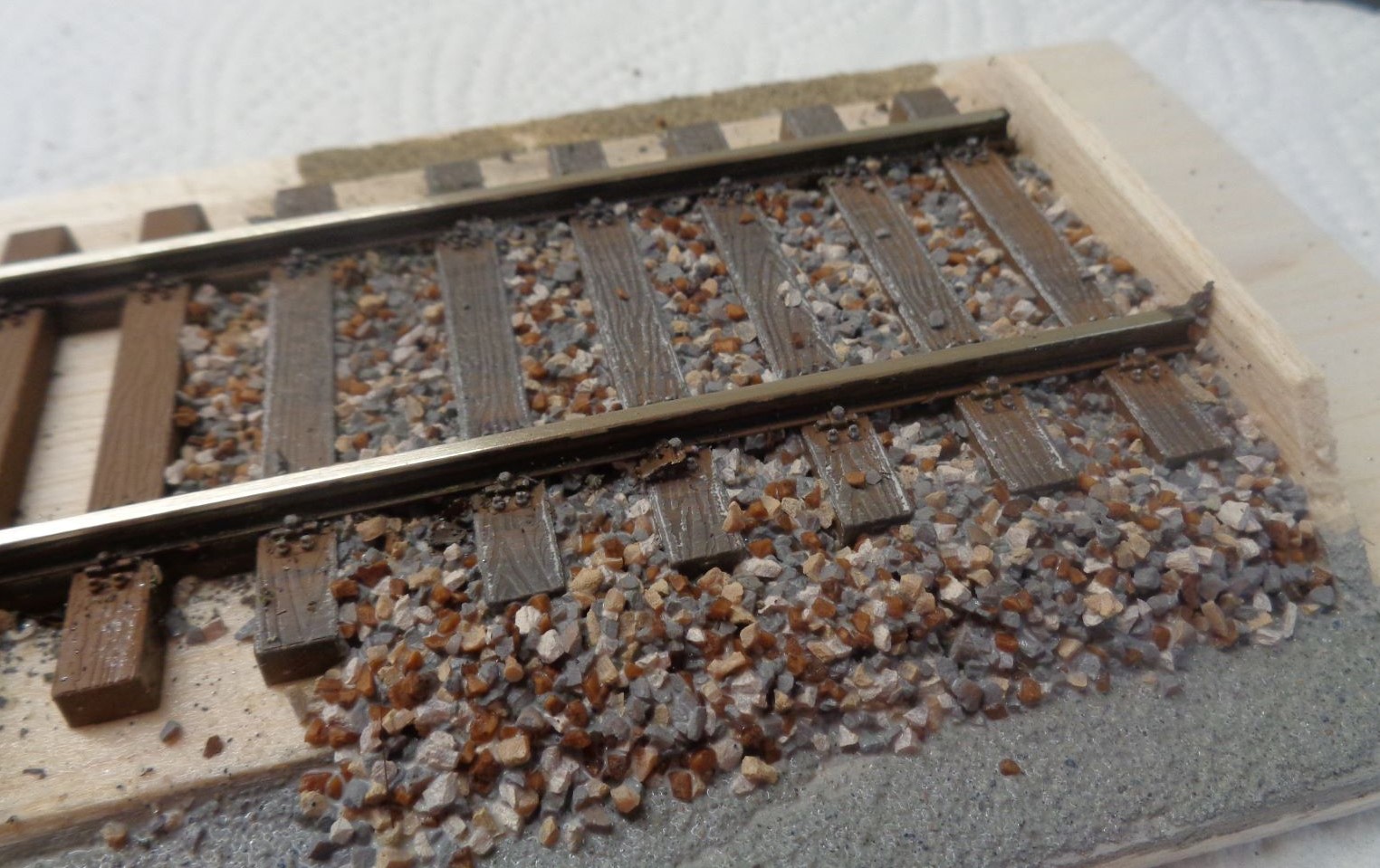 Und zum Schluss : Ob sie das Gleisbett lieber etwas brauner, oder älter oder heller haben wollen sei Ihnen überlassen. Machen sie mit alten Gleisstücken ein paar Muster…… Das gibt Übung und irgendwann sind sie bei Ihrem Wunschgleis. Der Schotter ist übrigens auch in feiner Körnung ( für H0 und N ) zu kaufen.
