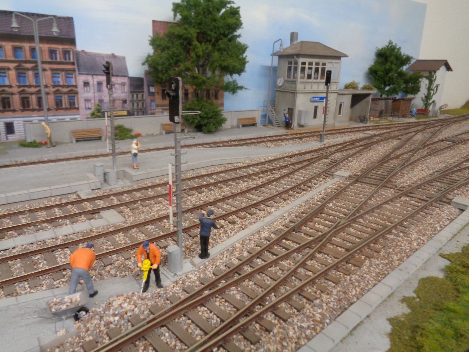 Vorgehen : Färben der Schienen mitt HR-Rost ( Bild Mitte ) Es kann natürlich jeder Braunton in Ihrer Wunschfarbe verwendet werden. Altern der Schwellen mit Grundierung, Schokoladenbraun matt etc. Um die Spitzen hervorzuheben nehme ich ganz wenig weisse Abtönfarbe auf einen grossen Pinsel und fahre ganz leicht über die Schwellen. ( Bild aussen rechts )