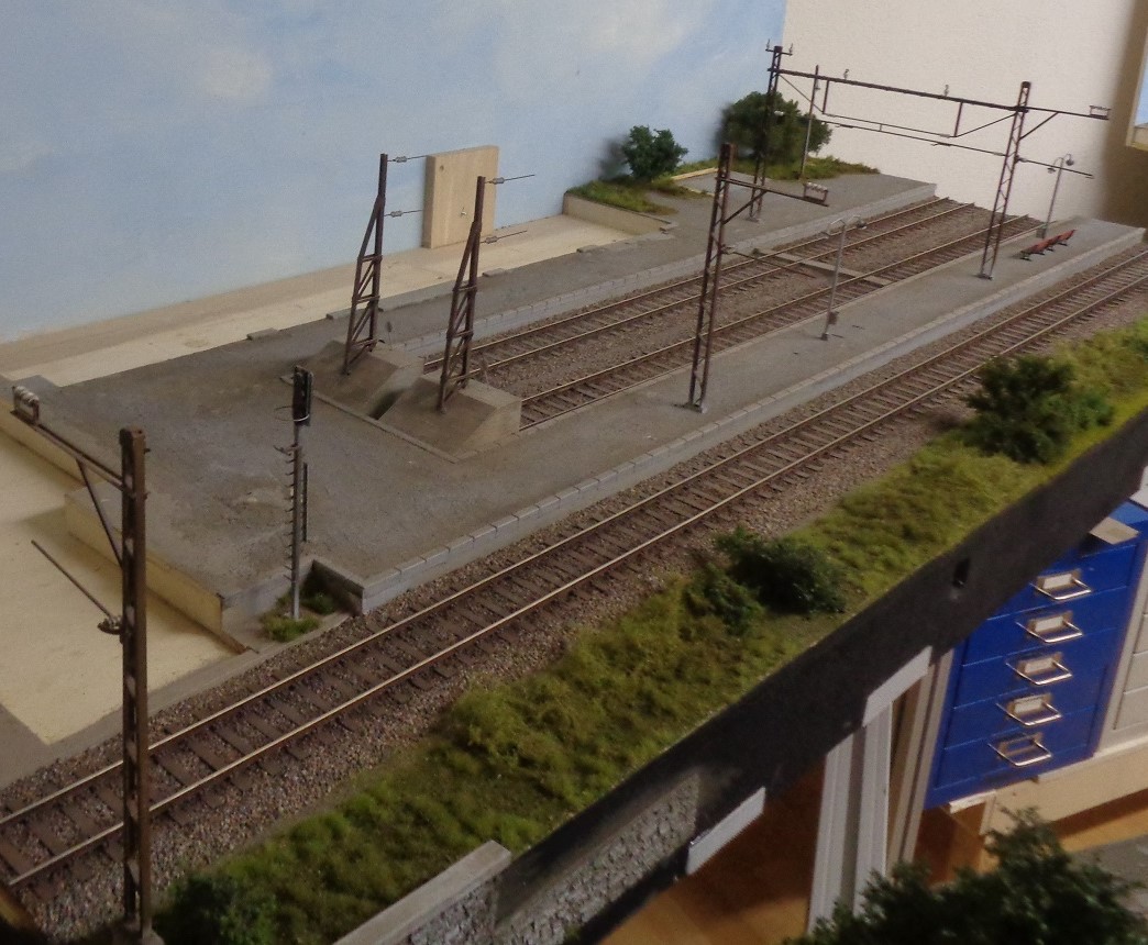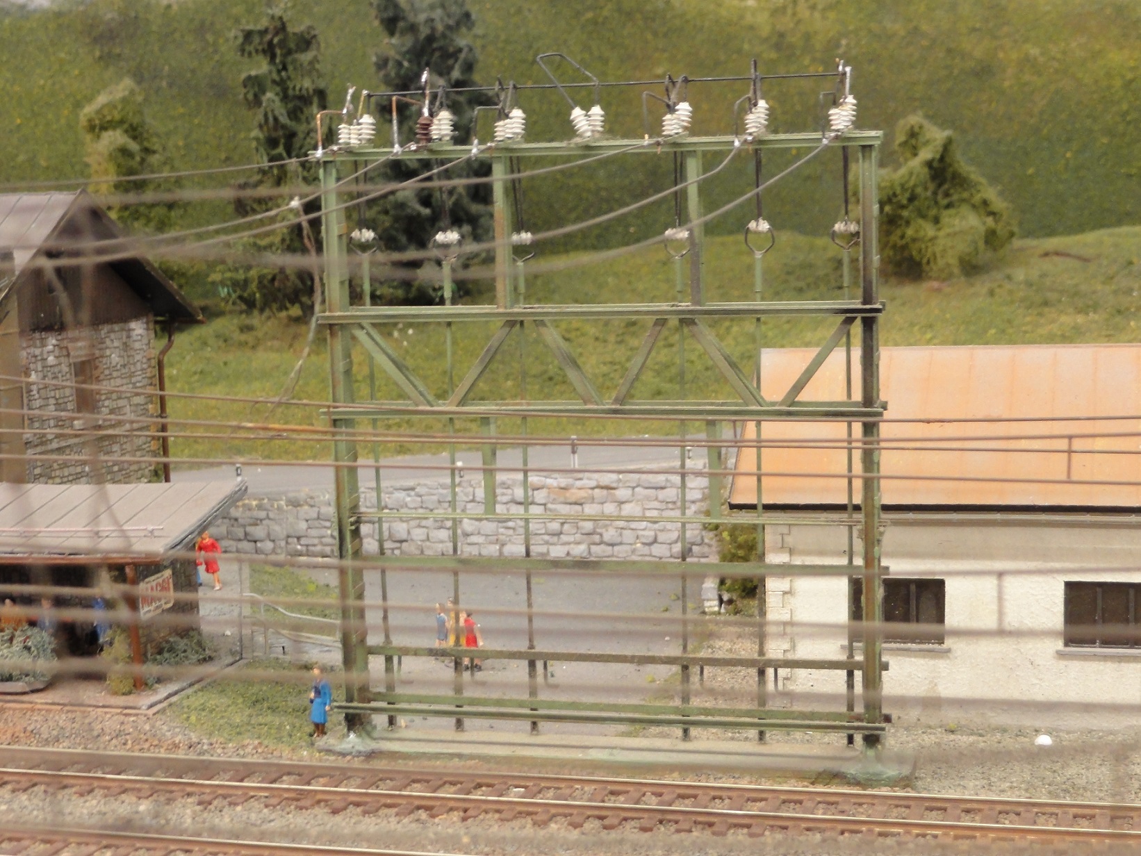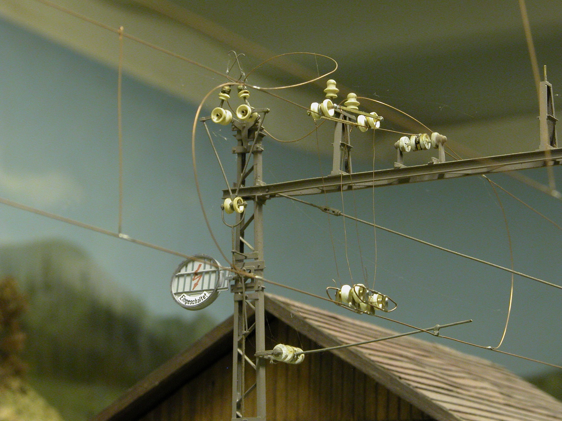 Im Anhang ( Bilder 7 – 9 ) Masten auf meiner ersten Spur 0 Anlage. Die Bilder 10 – 14 zeigen das Schaltgerüst in H0 auf der sehenswerten Anlage des MEC Bregenz im Bahnhof Langen am Arlberg.