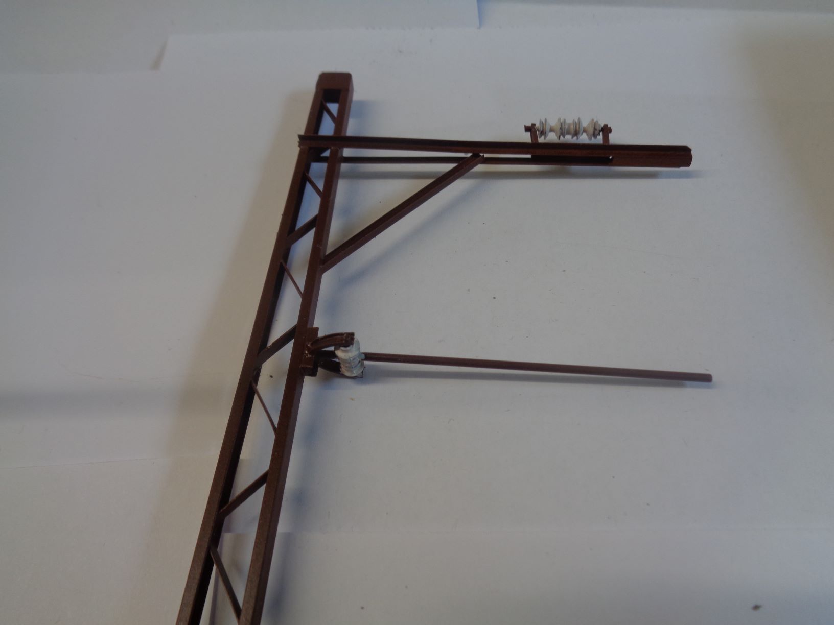 Bild 1 zeigt verschiedene Masttypen welche auf meinem Bahnhofsmodul gebaut wurden. Bild 2 zeigt die Teile welche ich zum Bau der Masten verwendete. Links die einfache Holzlehre, welche zum Biegen des Zickzack im Mast dient. Auf Bild 3 Schleudergussteile zum Mastbau.