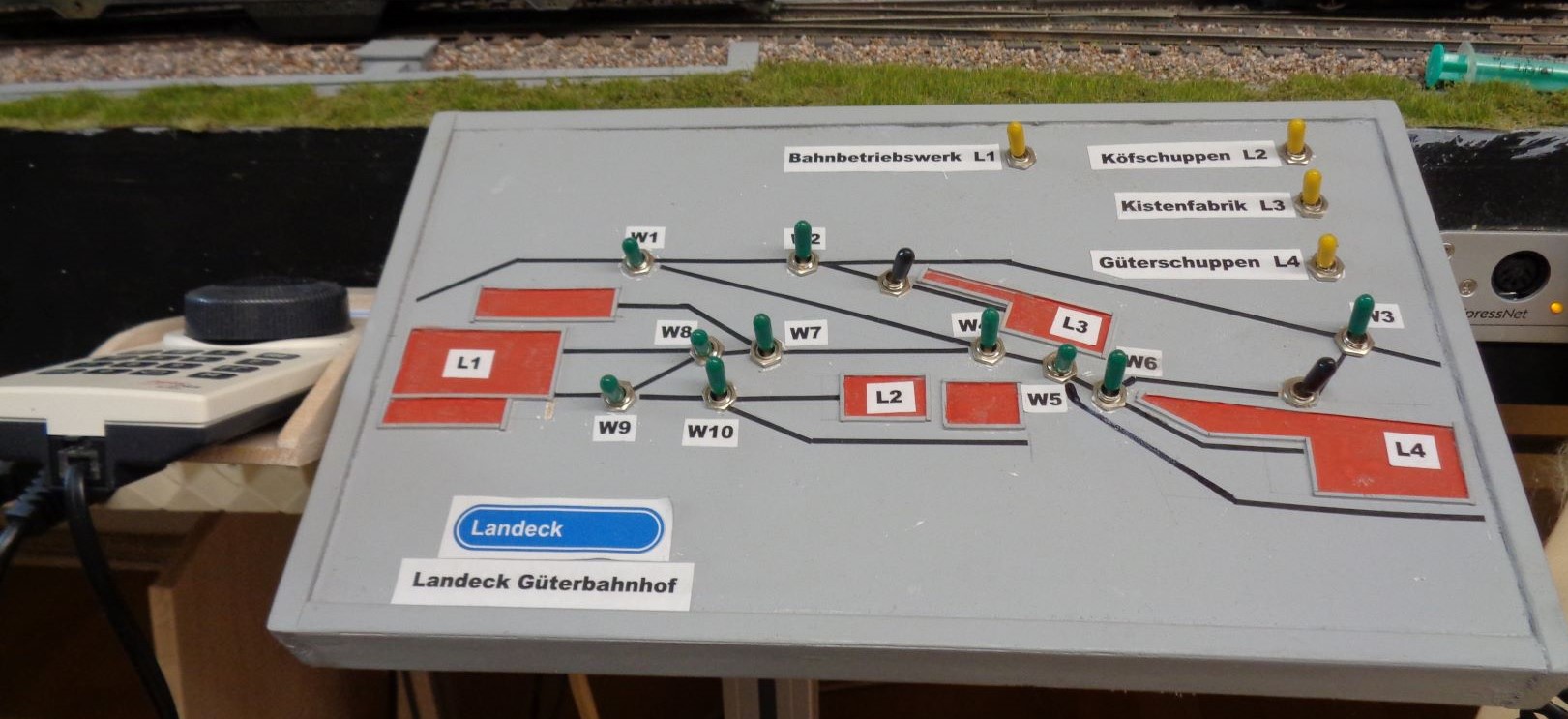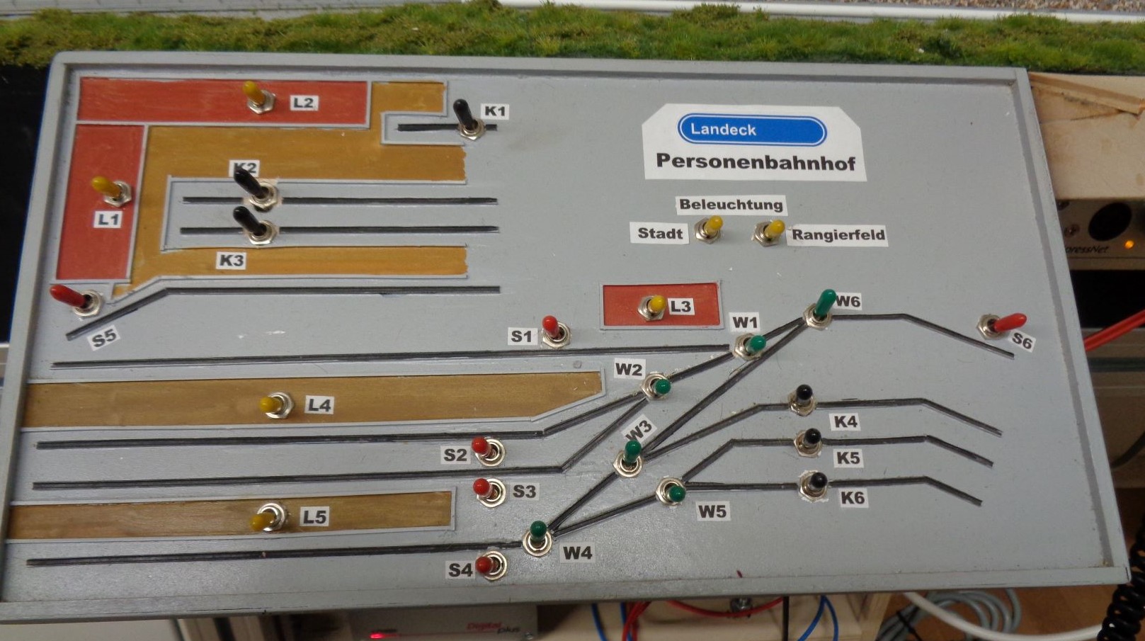 Die Signale im Bahnhof sind Marke Eigenbau. ( Bilder 9 /10a und 10b ) Sie bestehen aus Messing Ätzteilen welche ich bei der Firma www.bie-tech.li anhand meiner Handskizzen herstellen liess. Diese Firma fertigt schon seit etlichen Jahren Teile für mich und ist sehr zu empfehlen. Da stimmen Service und auch Preis. Die elektrische Verdrahtung der Signale liess ich durch www.microscale.ch machen. Denn das Elektrische war und ist das einzige, welches mich als Modellbahner nie weder interessiert noch fasziniert hat. Da lass ich lieber die Profis ran. Danke auch an Michi (REAK) für die super Anlagenverdrahtung.Die 2 Schaltpulte sind wieder selbst gebaut. Also alles was oben ist. Mit einfachen Kippschaltern von Conrad etc. Unten war dann wieder bereits erwähnter Michi zuständig. (Bild 11a und 11b)Ach ja, für die Interessierten : ich fahre mit LENZ digital. Das hab ich grad noch so knapp im Griff. ( Bild 15 )