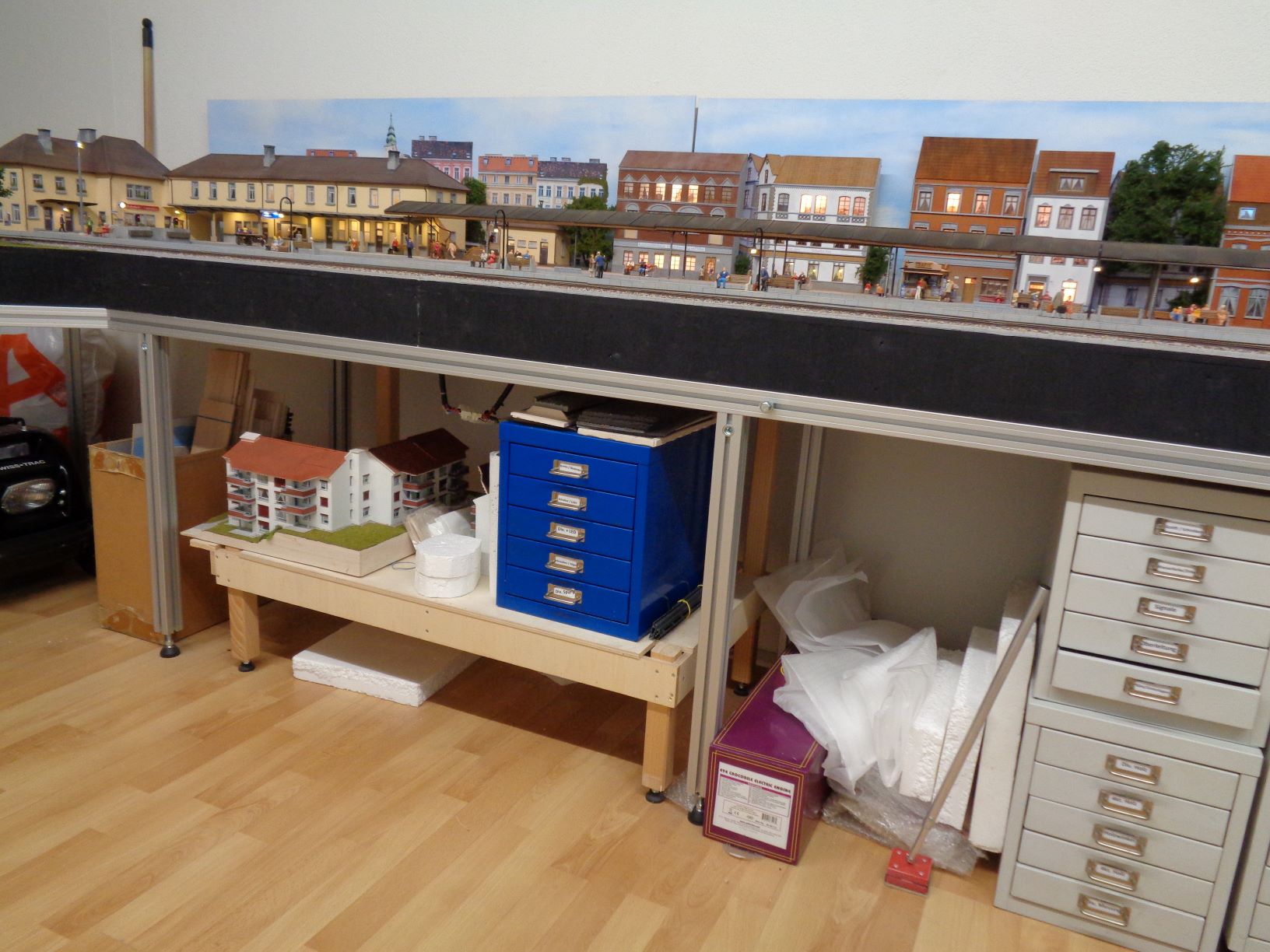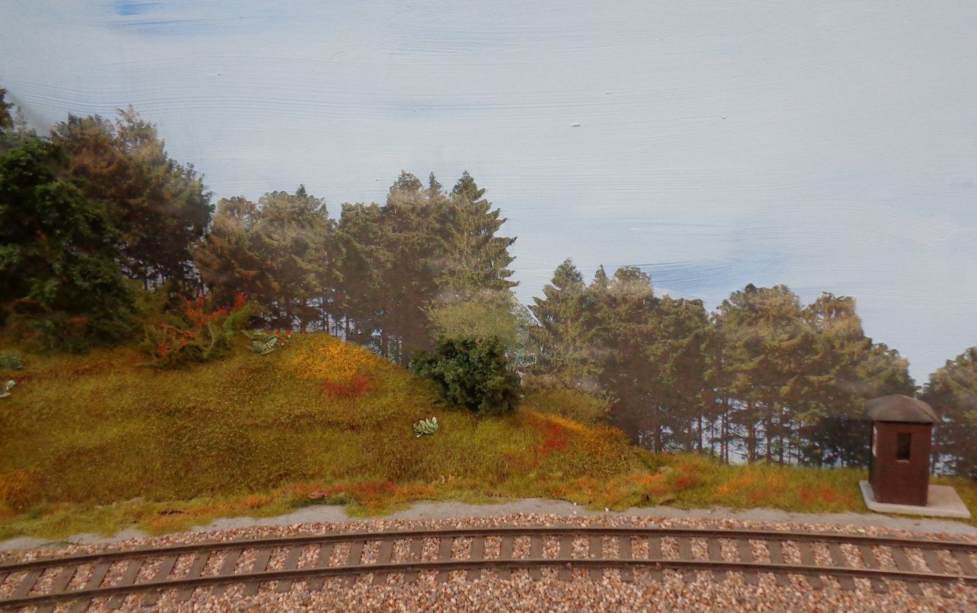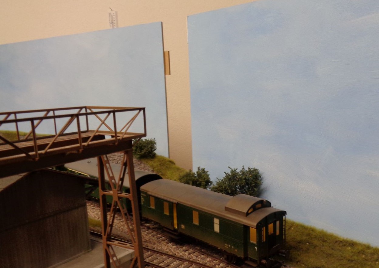 Den blauen Anlagenhintergrund male ich mit Abtönfarbe auf 3 mm Kastenrückwände, welche ich in entsprechender Grösse im Baumarkt bestelle. Aus demselben Material mache ich einfache Halterungen welche an den einzelnen Modulen angeschraubt werden. So können diese Hintergründe einfach eingeschoben werden. Und bei Bedarf sogar gegen andere ausgetauscht werden. Die Waldhintergründe sind gegoogelte Bilder aus dem Internet welche auf A4 Selbstklebefolien ausgedruckt und einfach aufgeklebt werden. Genau wie auch die Stadthäuser im Hintergrund. ( Bilder 12a-d und Bild 13a 13b und 14 ) Um meine Wagen auch da zu entkuppeln ( Lenz Kupplung ) wo es keine Entkuppler gibt habe ich mir ein paar Entkupplungshilfen gebaut. ( siehe Tipps und Kniffe )