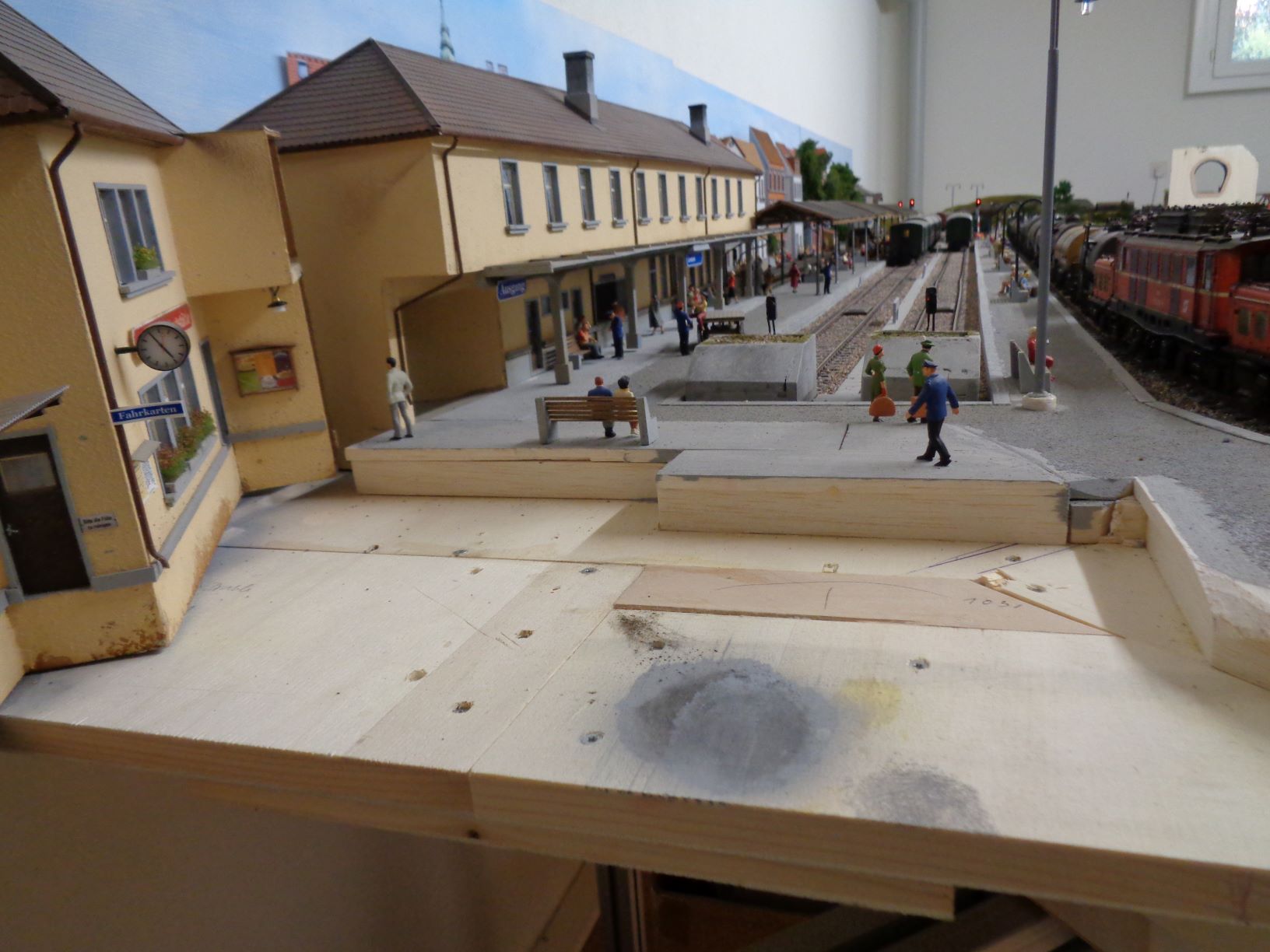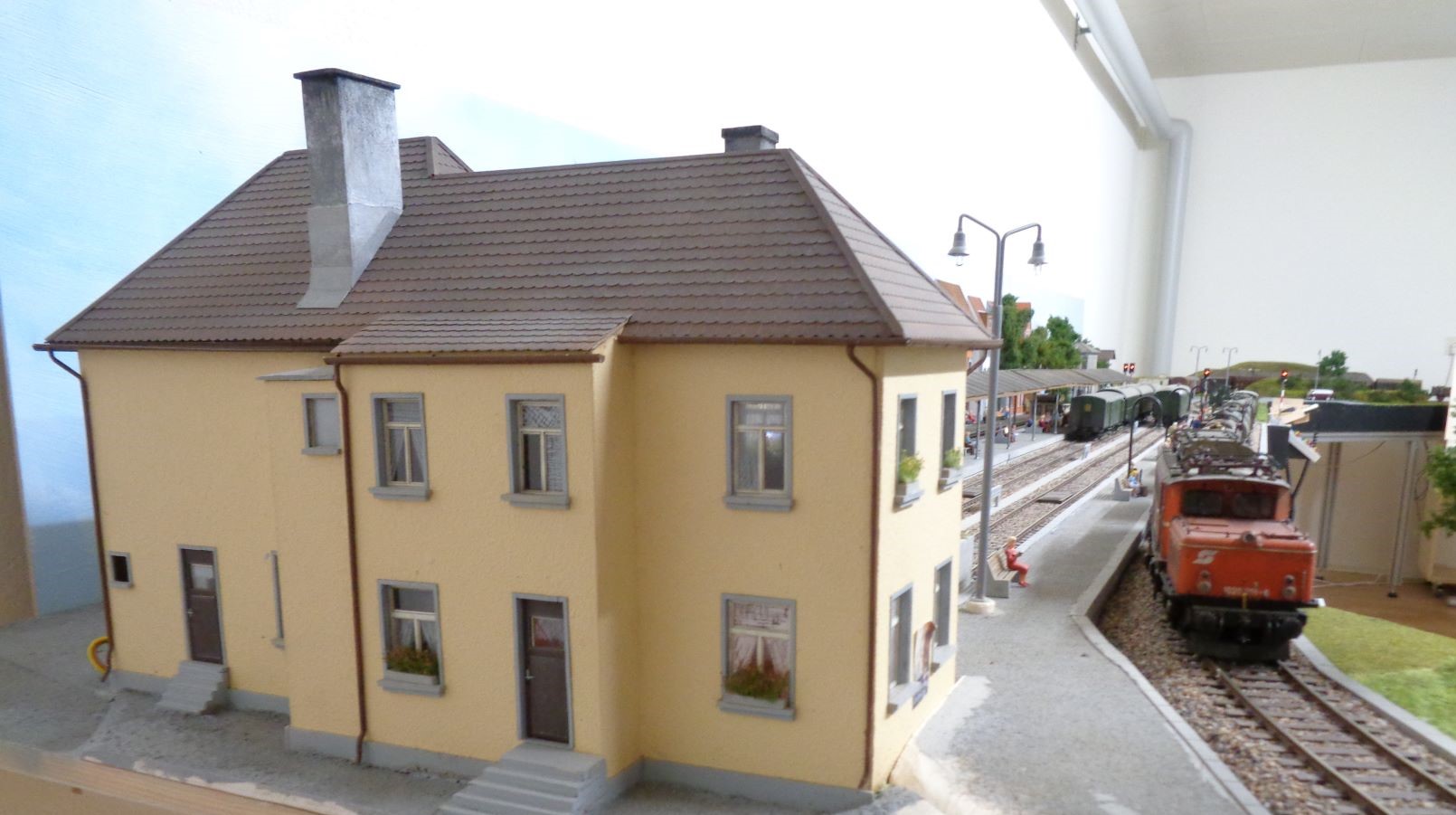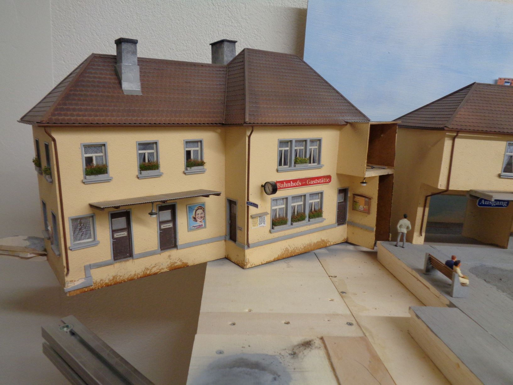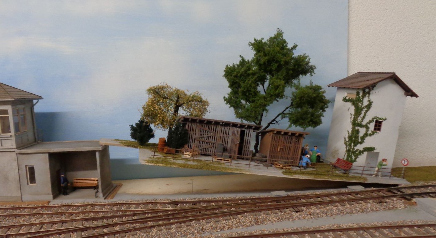 Auch hier sind alle Gebäude so gebaut, dass sie aus dem Modul herausnehmbar sind. Die Bahnsteige und der Bahnhofsplatz sind auch wieder aus Balsaholz aufgebaut, wie ich dies bei Sägerei und Güterschuppen beschrieben habe. (Bild 1a und 1b)