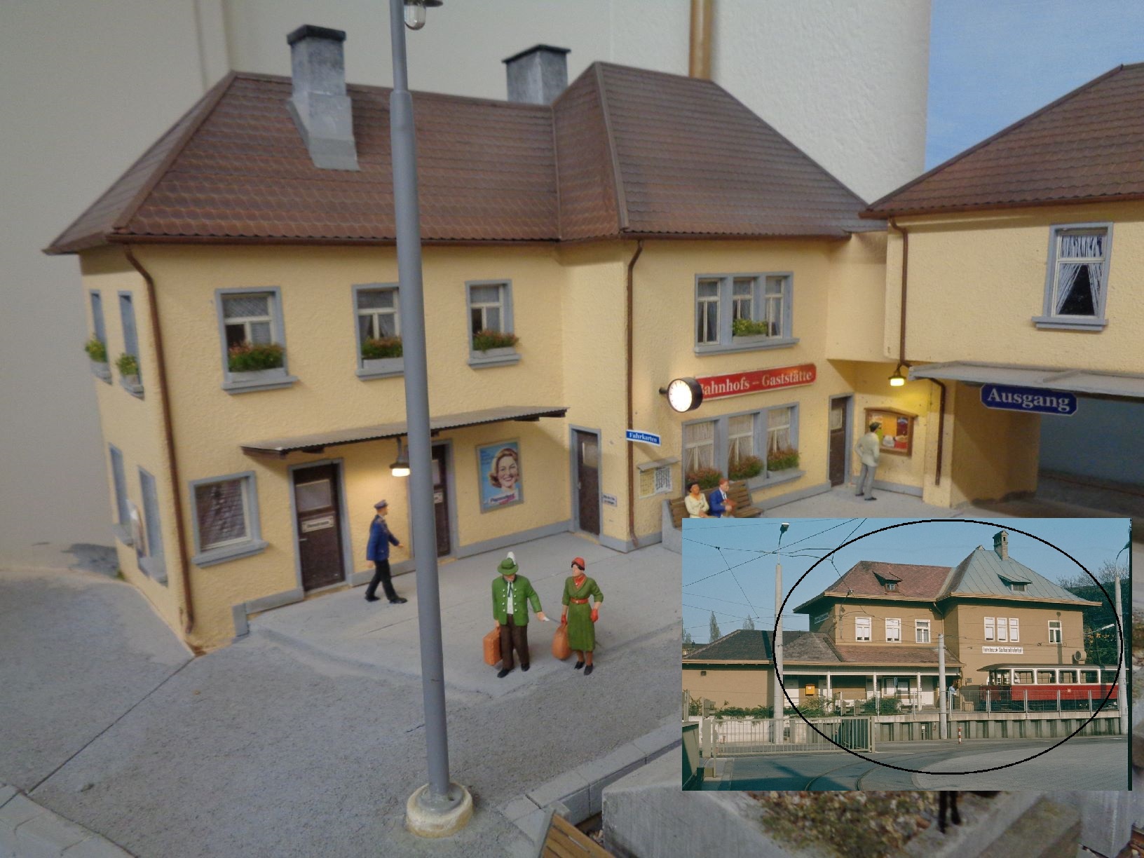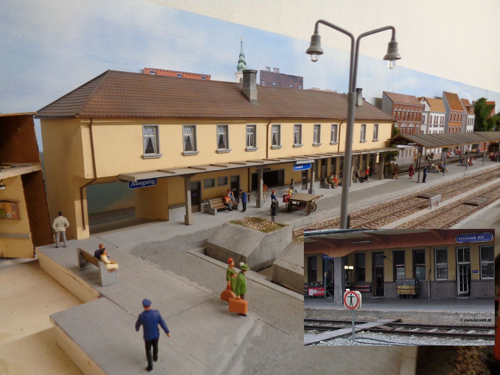 Der lange Anbau mit Gepäckaufgabe (Bild 3) wurde Anhand eines Fotos gebaut welches den ehemaligen Karwendel- bahn Bahnsteig in Innsbruck zeigt. Hier hielten damals die Züge, welche von München über die Karwendelbahn nach Innsbruck fuhren.