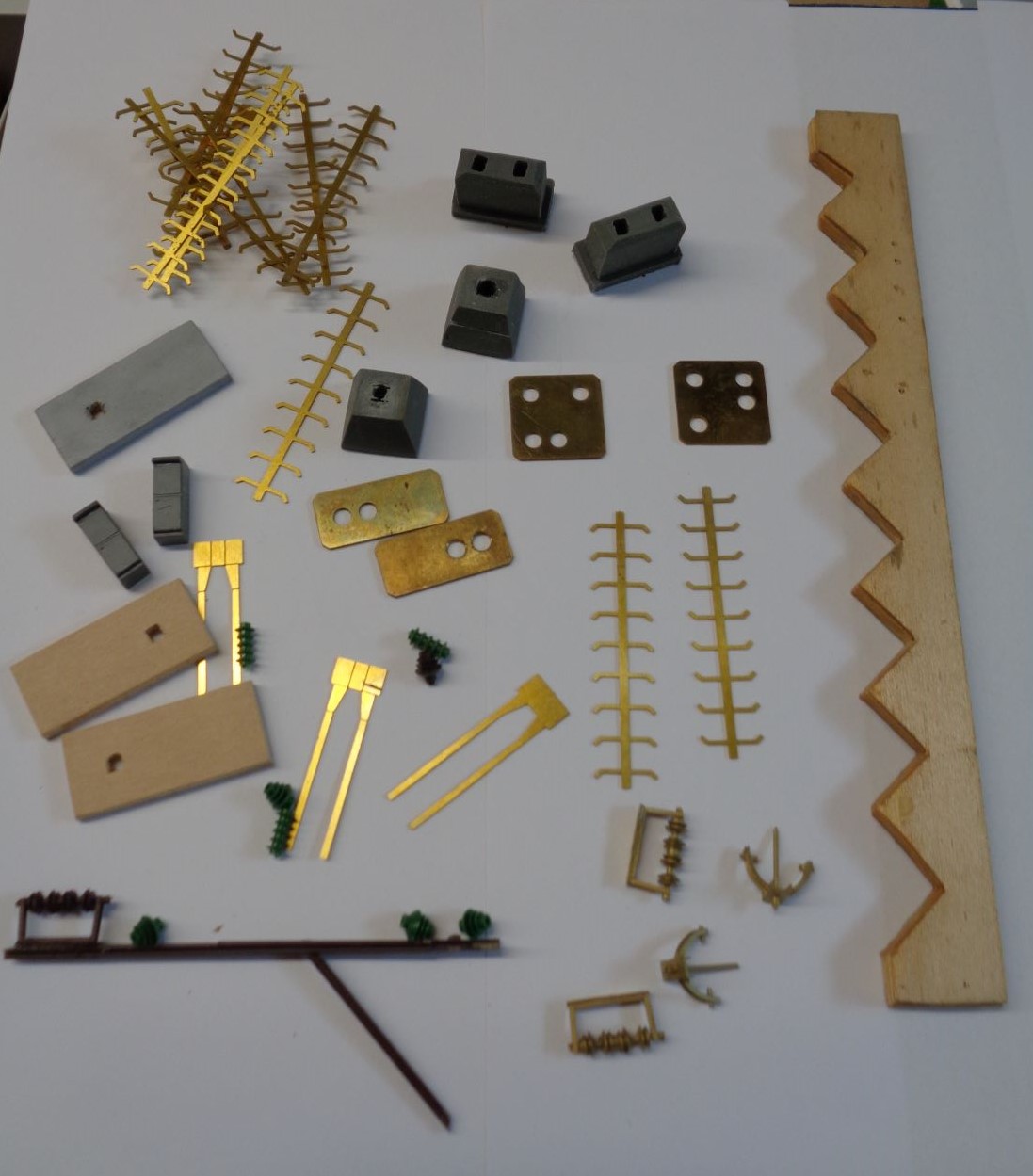 Der Bahnsteig ist wie gesagt aus Balsaholz gebaut. Die Bahnsteigüberdachung ist ein Eigenbau und hat kein konkretes Vorbild. Die Stützen sind aus Messing. Diese hatte ich früher für den Bahnhof Braz schon in H0 fertigen lassen. Dieser Bahnhof war ein Kundenauftrag. Diese Stützen stecken nur in Bohrungen im Bahnsteig. Die ganze Überdachung besteht aus 3 Teilen und kann somit ausgebaut werden. Für die Zuführung des Stroms zur Bahnsteigbeleuchtung sorgt ein Bahnbenützer mit Lüsterklemmenanschluss an den Füssen ( Bilder 4-6)