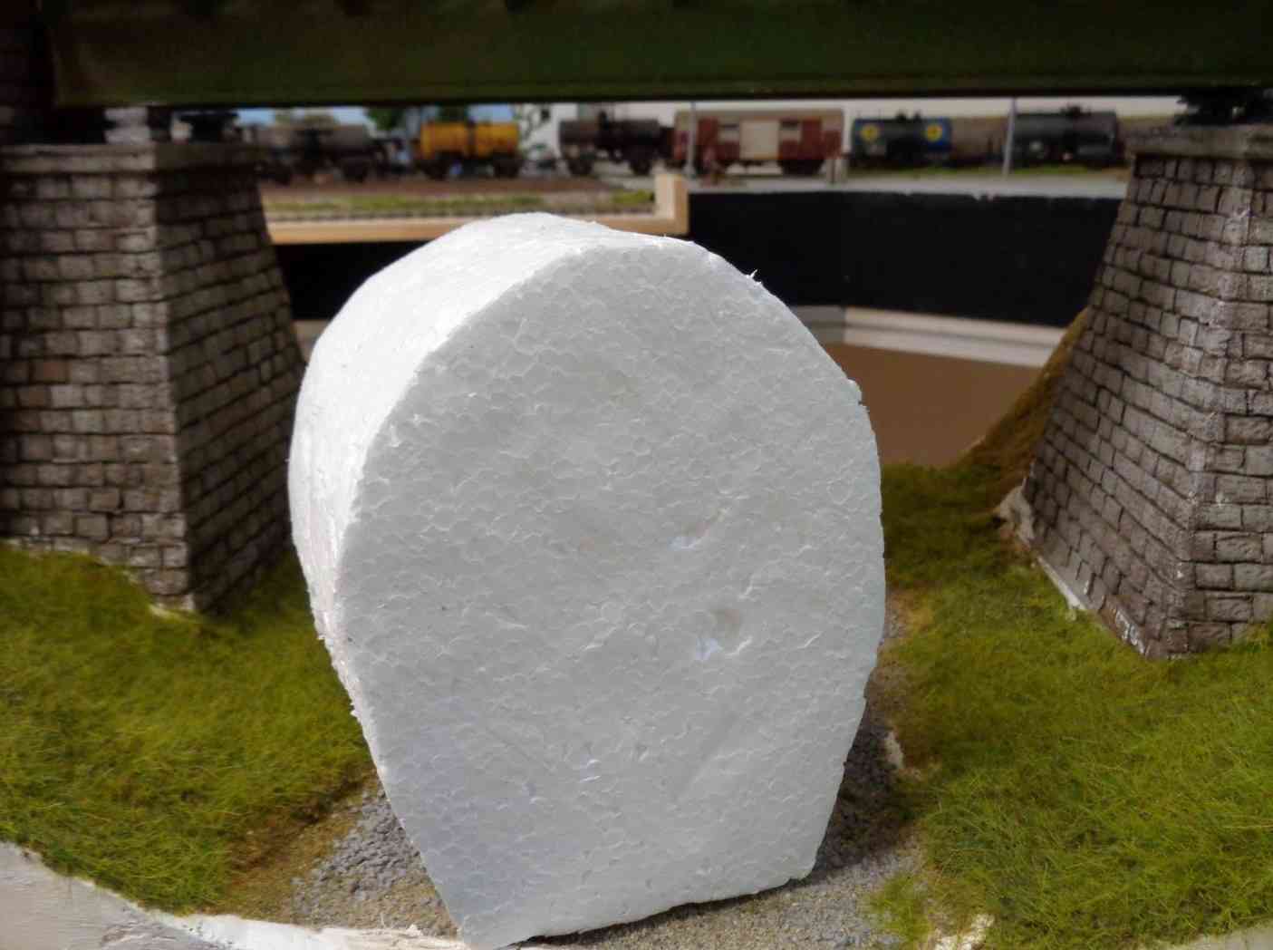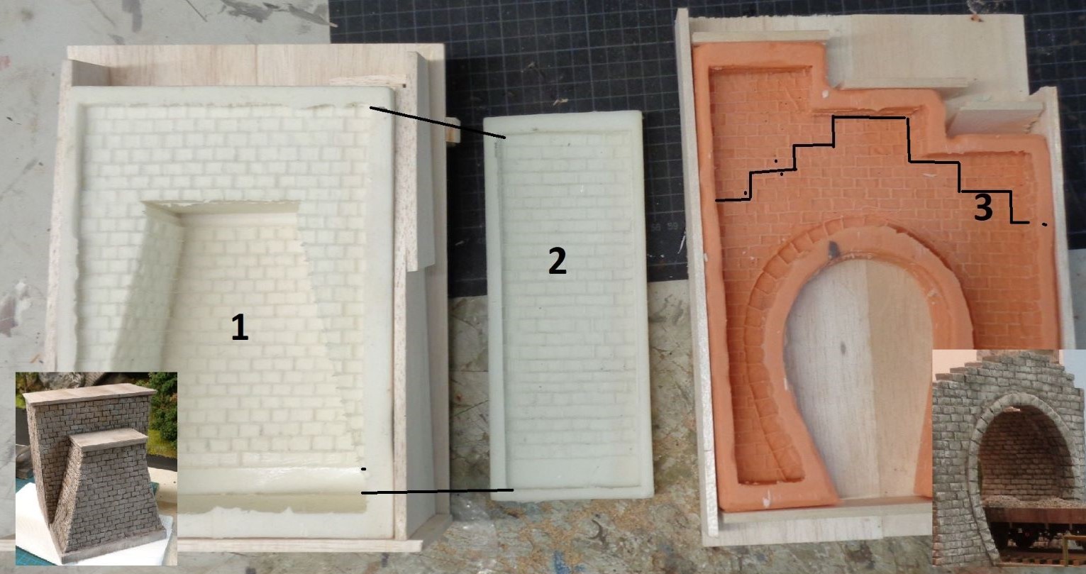 Da ein Tunnel als Modulabschluss immer gut wirkt habe ich einen Abguss des Engelwandtunnels gemacht und diesen oben entsprechend zugeschnitten 3. Die Tunnelröhren entstehen aus den seitlichen Mauerplatten 2, welche ich noch in weichem Zustand (wie Gummibärchen) aus der Form nehme und über einen zurechtgeschnittenen Balsaklotz lege. Nach dem Aushärten ist die gebogene Form fest.