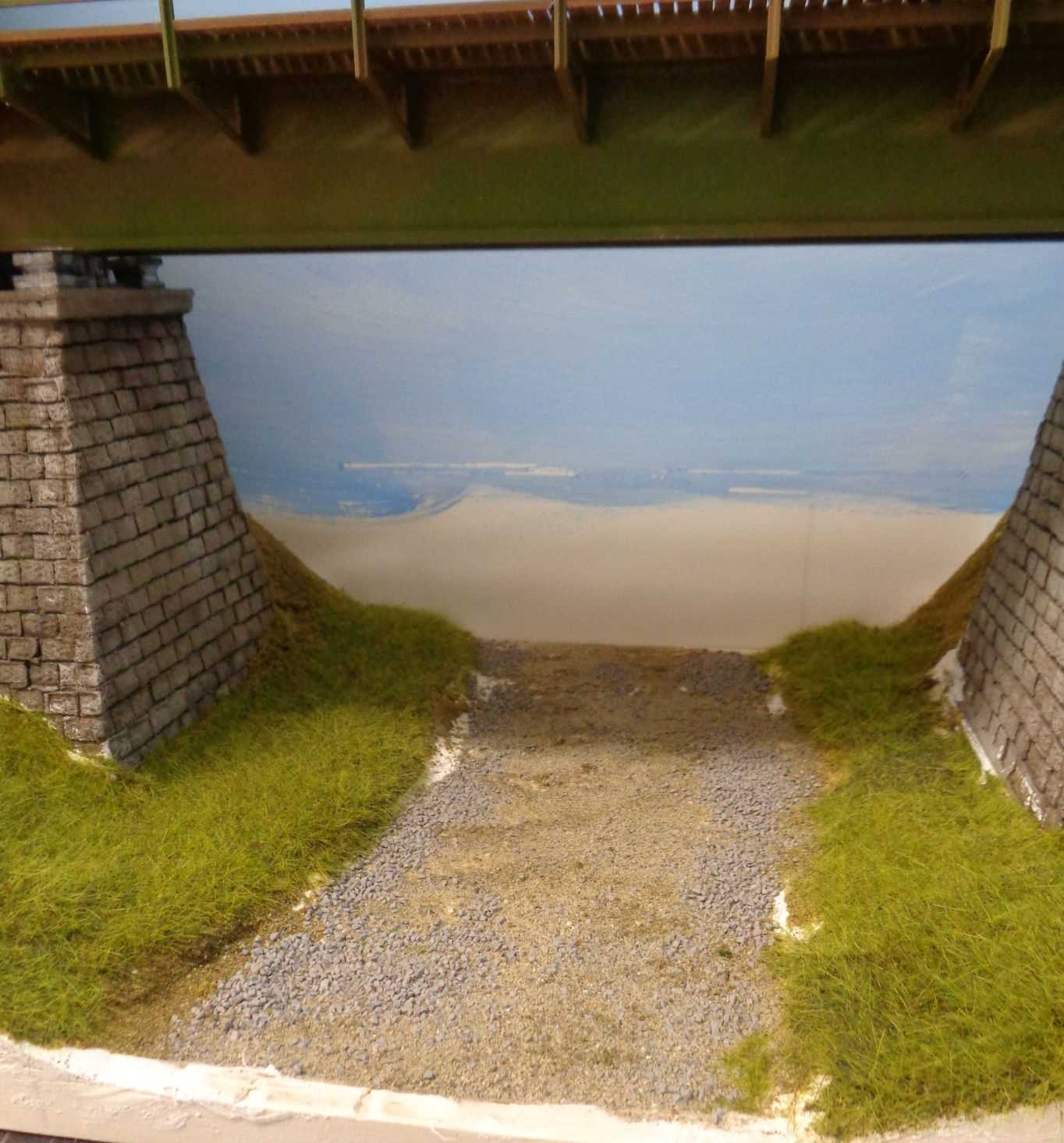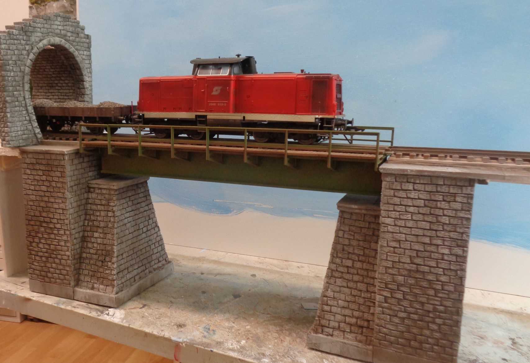 Von meinem Kollegen Peter bekam ich eine angefangene Stahlbrücke der Firma Addie-Modell geschenkt. Ganz spontan entstand der Gedanke, daraus ein kleines Fotografier Modul für Spur 0 Modelle zu bauen. Um es leicht zu transportieren, hat es nur die Grösse 80 x 30 x 40 cm. Da ich nur die Brücke, aber weder Brückenpfeiler noch Auflager hatte, war Selbstbau angesagt. Die Brückenpfeiler entstanden wieder in der bewährten Mauerritzmethode beschrieben in «Tipps und Kniffe»