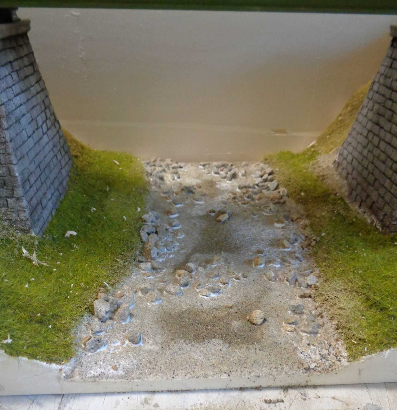 Als erstes wird der Boden des Flussbettes gestalltet. Dazu verwende ich verschiedene Steine aus dem Sandkasten der Tochter, von Woodland, Noch etc. Sind diese Steine im Flussbett ausgelegt folgt das Vorgehen wie beim Einschottern des Gleises. Mit Wasser besprühen und dann verdünnten Weissleim über alles träufeln. Dazu nehme ich eine kleine Flasche Alleskleber in welche ich den verdünnten Weissleim einfülle. Nach dem Trocknen ist alles hart. Nun «Wasser» 1 : 1 mischen (diesmal probierte ich das Harz von Noch) Diesem Harz mische ich jeweils etwas grünliche Wasserfarbe bei, da ein Gewässer ja meist seine Umgebung spiegelt und da dieser Flusslauf im Walde ist eben grün. Für einen See wäre eher blau angesagt. Ist der Fluss trocken, modelliere ich mit «Schaum und Gischt» von Noch die Wellen welche um die Steine entstehen. Mit etwas Weihnachtsglitzer setze ich noch Lichteffekte auf die Wellen.