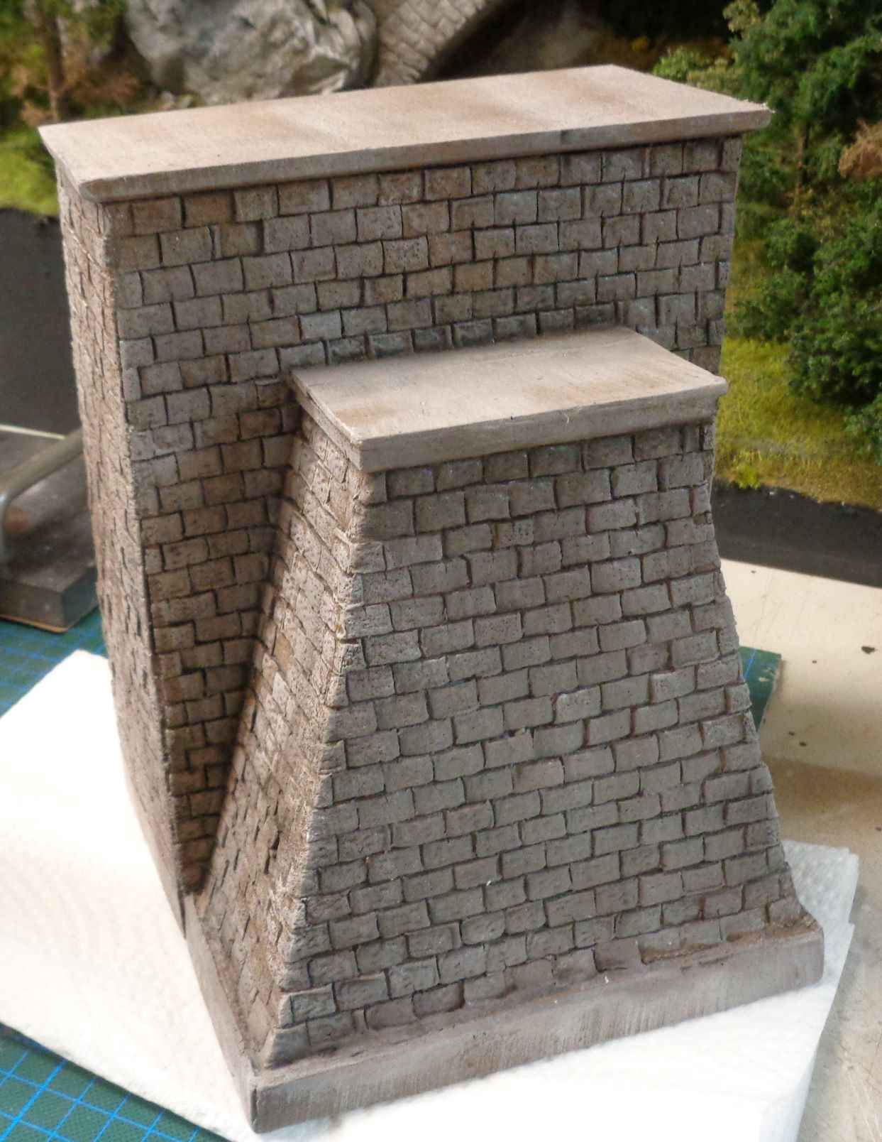 Da auch ein anderer Kollege bereits eine solche Brücke besass, und eh 2 Brückenpfeiler gebraucht wurden, entschloss ich mich aus diesen Urmodellen eine Silikonform zu Giessen um weitere Brückenpfeiler in Resinguss herzustellen. Silikon, Kunststoffgussmittel etc. beziehe ich seit Jahren bei der Firma www.studerkunststoffe.ch in Fulenbach. Da stimmen die Beratung und Service. Um die Silikonform nicht allzu gross werden zu lassen, habe ich nur den vorderen Teil als komplettes Stück gebaut 1. Die seitlichen Verlängerungen des Pfeilers sind Kunststoffplatten, für welche ich auch ein Urmodell sowie eine Form baute. Die Abdeckplatte der Pfeiler entsteht wieder aus Balsaholz, welches ich bei www.conrad.ch beziehe.