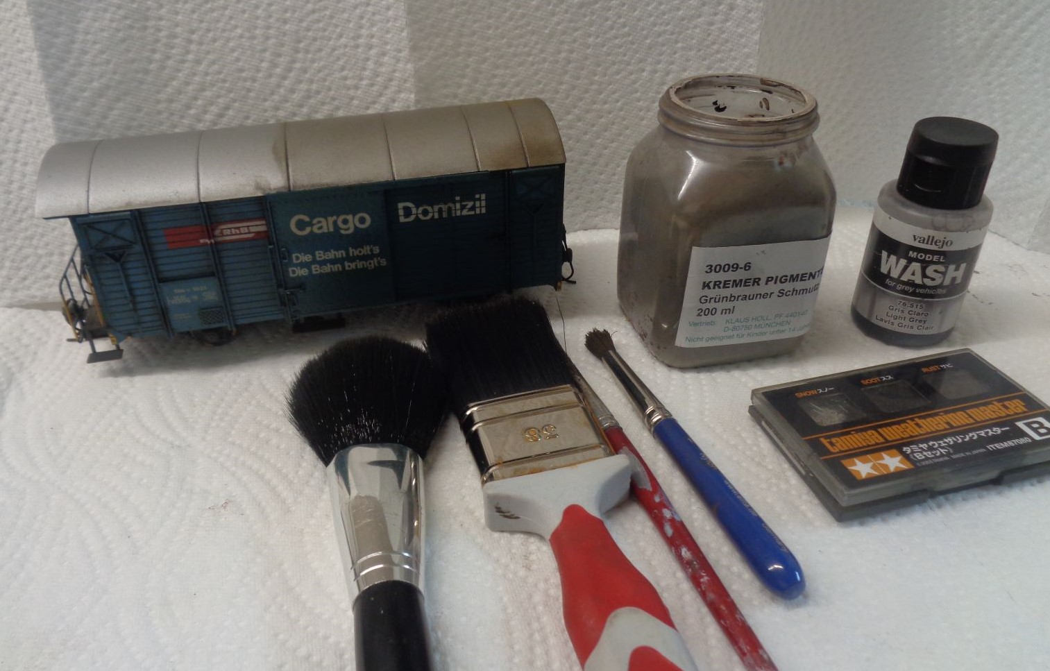 Die Rostflecken auf dem Dach ( dasselbe gilt auch für Rostspuren an den Drehgestellen ) entstehen mit einem stumpfen Pinsel und den Alterungssets von «Tamia weathering master»