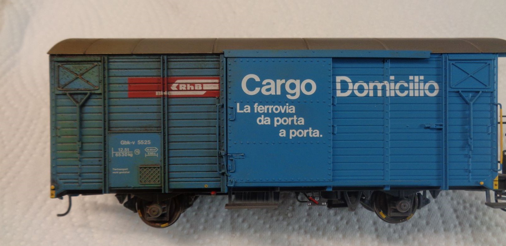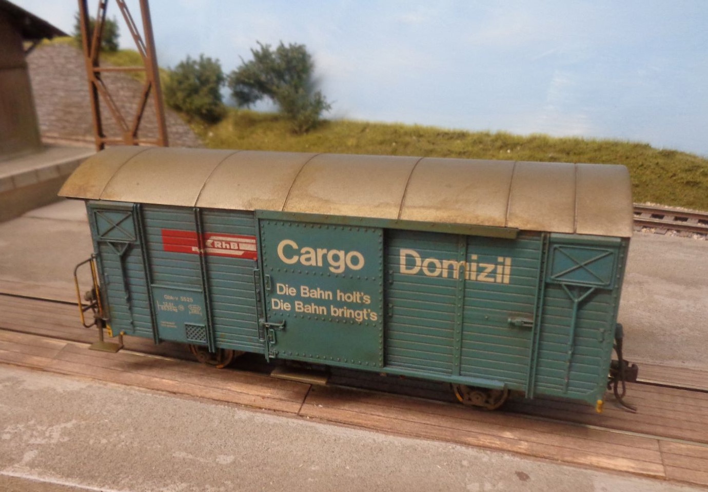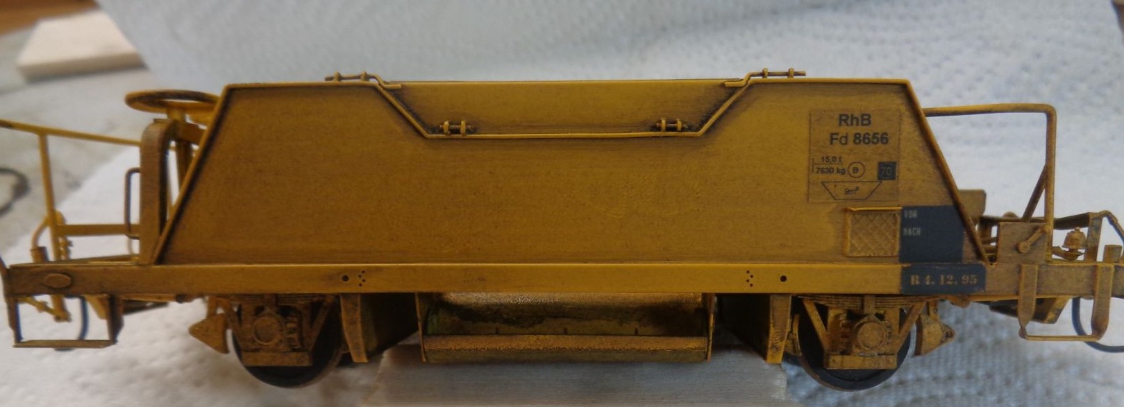 Das Messingmodell des gelben Schotterwagens wurde genau gleich gealtert wie der blaue BEMO Güterwagen. Da dieser Wagen eine Schotterladung bekommt sieht man innen noch das Originale gelb. Wie der Wagen 1 Stunde nach Auslieferung noch aussah.