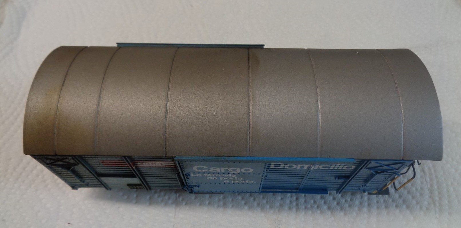 Als erstes bringe ich mit einem ganz normalen Wasserfarbpinsel etwas Vallejo Farbe « hellgrau» auf Wagendach und Wände. ( Halt Stück für Stück ) In diese Farbe mische ich je nach Stärke der Alterung etwas Kremer Pigmente «Schmutz» Dieselben Pigmente verwende ich auch bei den Felsen. Bevor die Farbe antrocknet, verwische ich diese mit einem breiten weichen Pinsel bis mir die Stärke der Alterung gefällt. Auf nebenstehenden Bildern sieht man noch die Originalfarbe von Dach und Wänden. Zuletzt wische ich noch relativ fest und schnell mit dem super weichen Friseurpinsel ( auf Bild 1 ganz rechts ) über die Flächen. So verteile ich die Farbe so fein als wäre es mittels Airbrush aufgetragen. Und der grosse Vorteil des weichen Pinsel ist, dass die Gefahr feine Teile abzureissen relativ gering ist. Na ja, unter das Rastermikroskop darf man schon nicht. 😊 😊 Anschliessend lasse ich alles gut durchtrocknen.