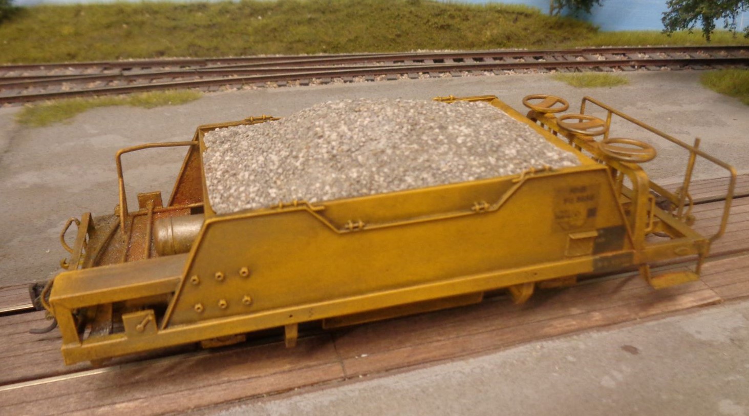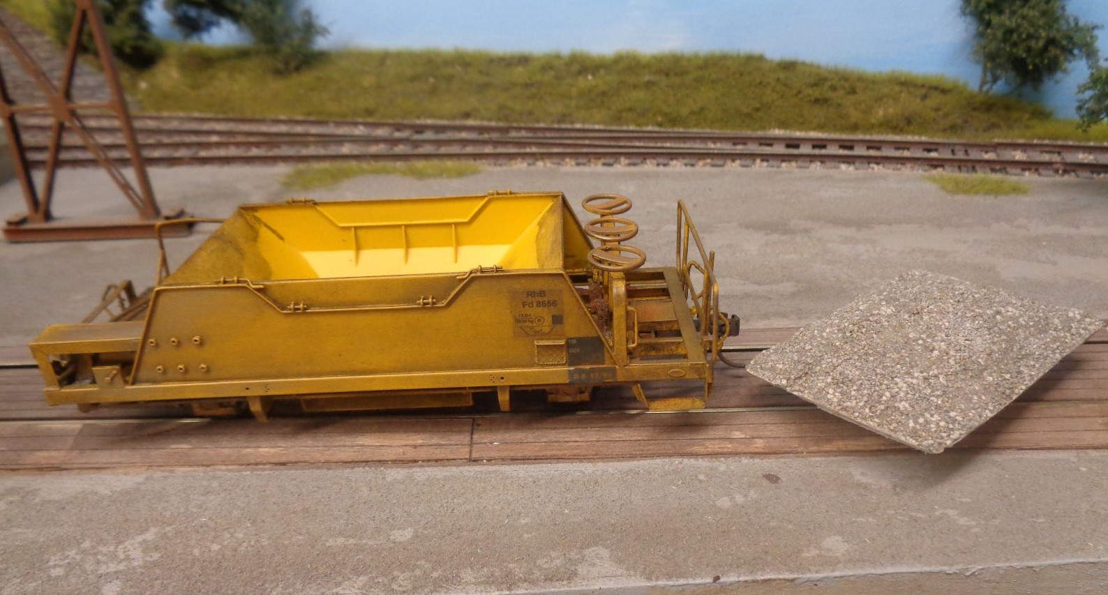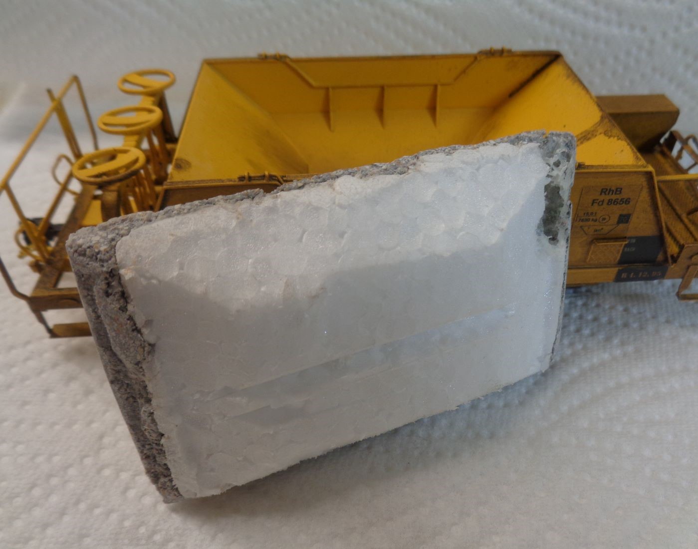 So entstand die Schotterladung …. Etwas Styropor in der Grösse des Wagens zurechtgeschnitten und mit Schotter beklebt. Fertig. Die Spezialisten welche natürlich die Ladungen hin und her schieben, sollten das Innere des Wagens auch altern.